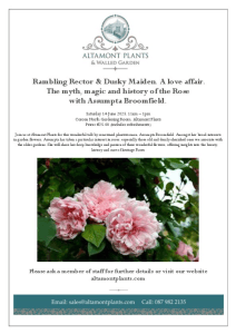 Join us at Altamont Plants for this wonderful talk by renowned plantswoman, Assumpta Broomfield. Amongst her broad interests in garden flowers, Assumpta has taken a particular interest in roses, especially those old and dearly cherished ones we associate with the older gardens. She will share her deep knowledge and passion of these wonderful flowers, offering insights into the beauty, history and care of heritage Roses.
